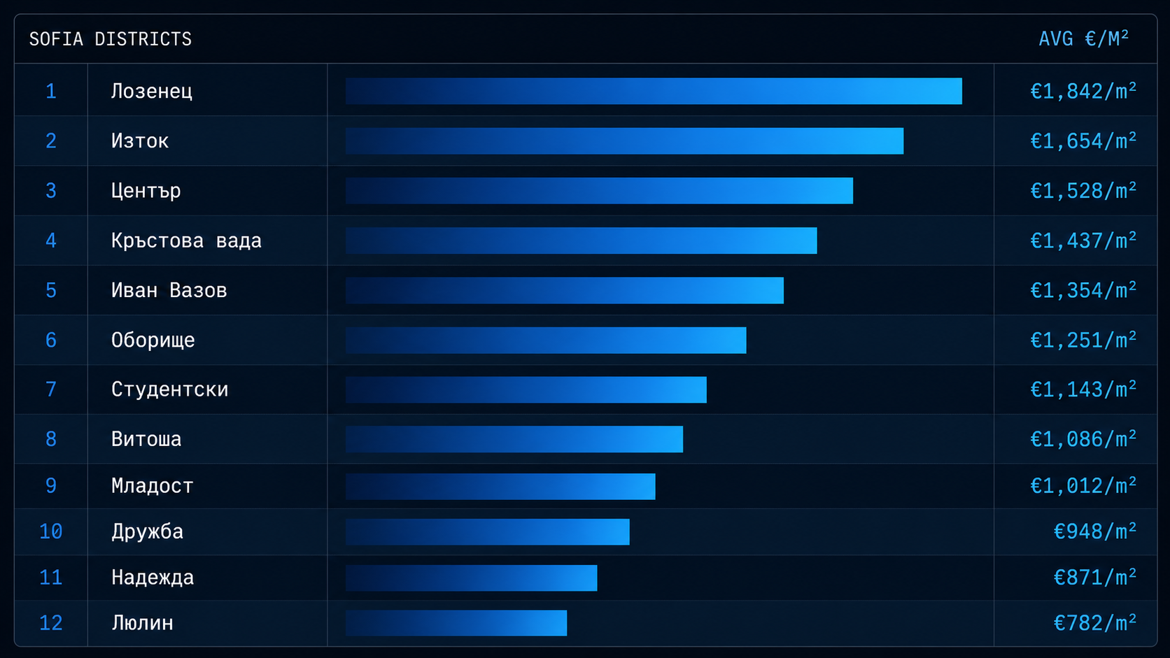 24 района наредени по средна цена на кв.м. — намери баланса между локация и бюджет.
